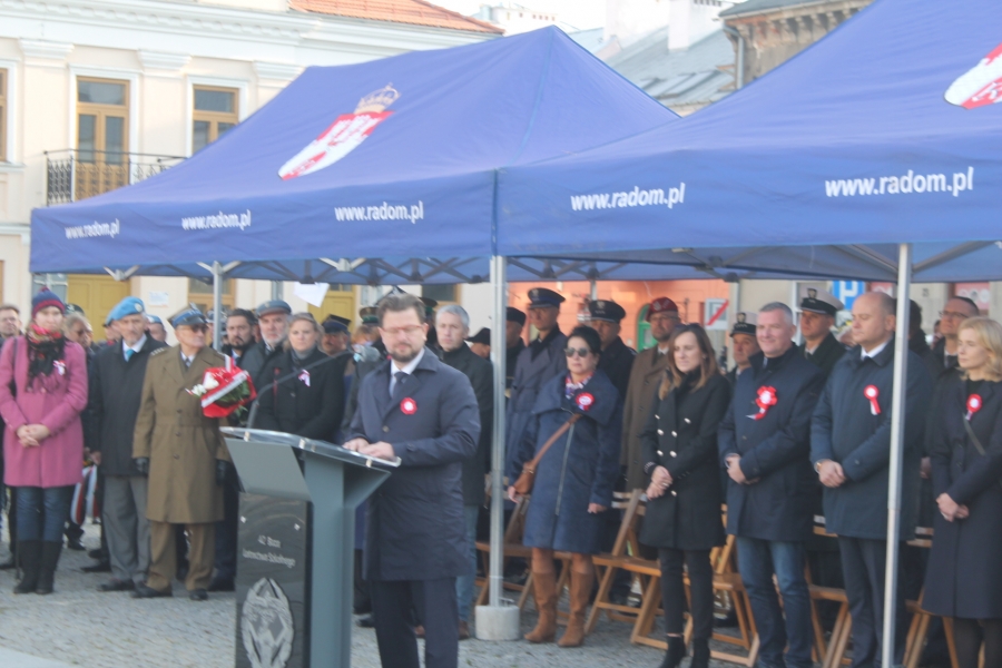 W czwartek  11 listopada  odbył się tu ceremoniał wojskowy , rozpoczęty złożeniem   przez dowódcę  Garnizonu Radom meldunku Wiceministrowi Obrony Narodowej Wojciechowi Skurkiewiczowi. W wypowiedzi  okolicznościowej W. Skurkiewicz  powiedział m.in. - Nieprzypadkowo od szeregu dni prowadzona jest akcja "Murem za polskim mundurem". To jest akcja wsparcia dla tych, którzy są na granicy, którzy zaraz mogą być na granicy, ale również dla ich rodzin. Zachęcam   do  wspierania  polskich żołnierzy, funkcjonariuszy straży granicznej, policji, gdyż oni na to zasługują. Służą  przecież Rzeczypospolitej, wypełniając słowa roty przysięgi.